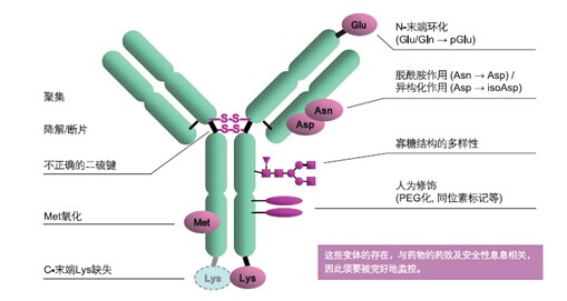 ????抗體是一種結構復雜的糖蛋白。即使是天然抗體,其結構也是各不相同。抗體類藥物在其生產工藝(培養、分離純化)或貯存過程中容易導致產品的不均一性,所以在藥物研發以及純化、生產過程中,對抗體藥物的定量和定性的分析時非常重要的。
