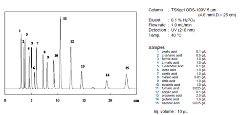 使用TOSOH公司的反相柱ODS-100V,就能同時分離各種有機酸。