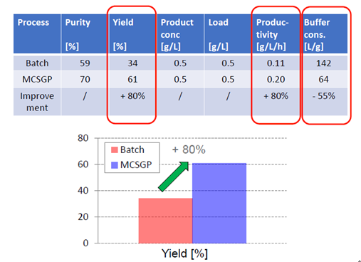有案例證明,MCSGP可將產(chǎn)品純度從傳統(tǒng)工藝的59%提升至70%,將收率從傳統(tǒng)工藝的34%提升至61%,從而使產(chǎn)量(g /L /h)整體提升80%,并同時使Buffer的消耗量降低55%MCSGP工藝,無疑可顯著地節(jié)約成本投入,并可產(chǎn)生更多的生產(chǎn)效益。