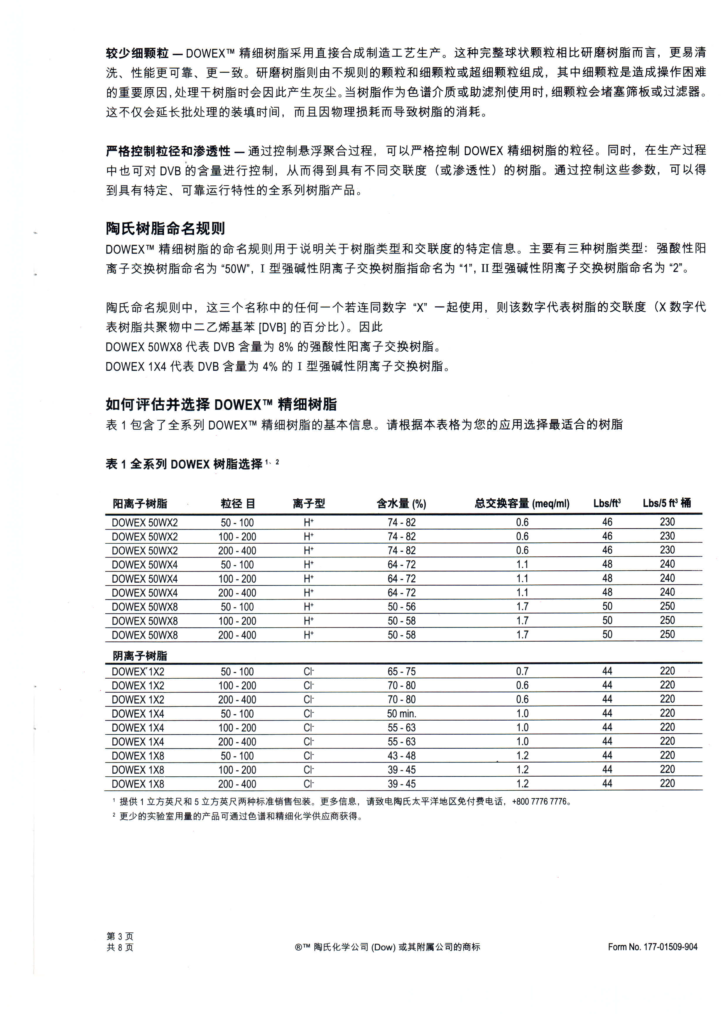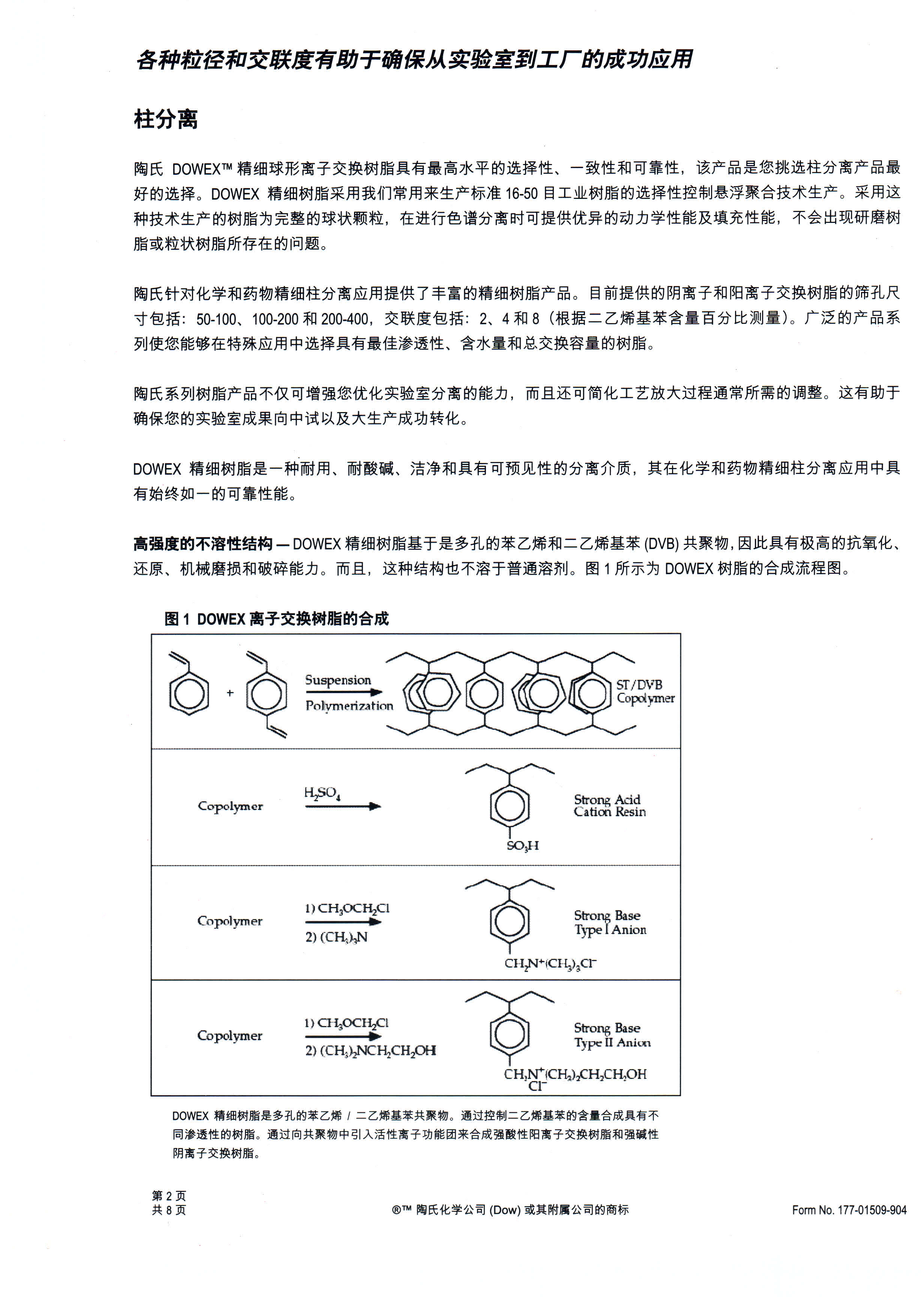 ?????? DOWEX系列離子交換色譜分離樹脂有強酸性陽離子交換樹脂和強堿性陰離子交換樹脂兩大類,每一類又根據交聯度(即DVB%)的不同劃分為3個小類,分別以“×2” “×4”“×8”表示,在此基礎上進一步提供3個粒度范圍可供選擇,即150-300μm50-100目)、75-150μm100-200目)以及35-75μm200-400目),共計18個樹脂牌號。顯然,不同交聯度的樹脂含水量不一,體積交換量、物質擴散的阻力各異,如此寬泛的產品范圍豐富了客戶的試用選擇,可以針對具體的應用優選出適宜的色譜分離樹脂。