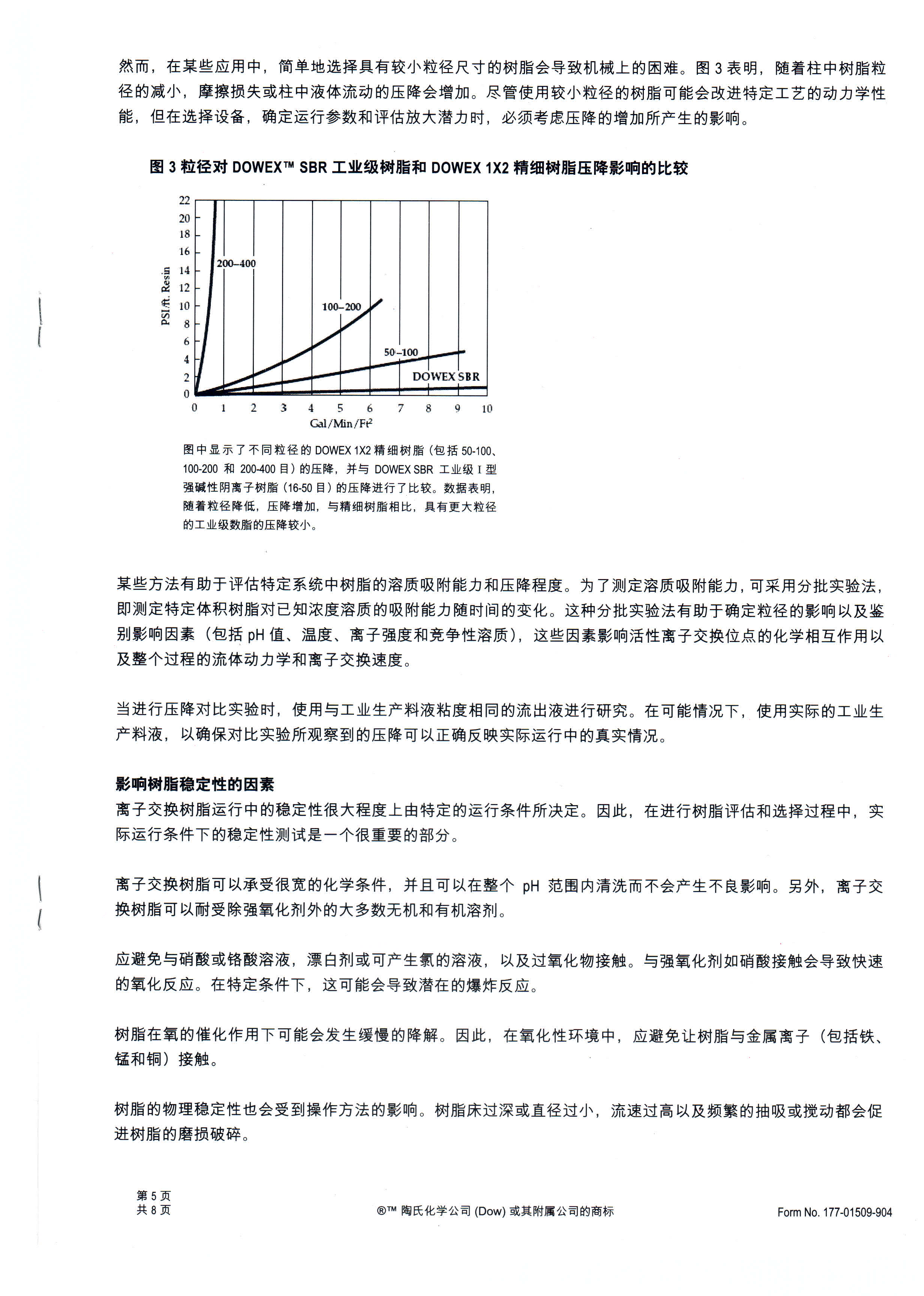 DOWEX精細樹脂采用陶氏生產標準16-50目工業樹脂所使用的選擇性控制懸浮聚合技術。采用這種技術生產的樹脂更為完整、均一,具有最高水平的選擇性、一致性和可靠性,因此,在進行色譜分離時可提供優異的動力學性能及填充性能,不會出現研磨樹脂或粒狀樹脂所存在的問題。通過控制懸浮聚合制造工藝,可以嚴格控制DOWEX精細樹脂的粒徑,避免處理干樹脂時因超細顆粒而易產生灰塵,避免作為色譜介質或助濾劑使用時細顆粒堵塞篩板或過濾器而延長批處理的裝填時間,造成物理損耗和樹脂的損耗。