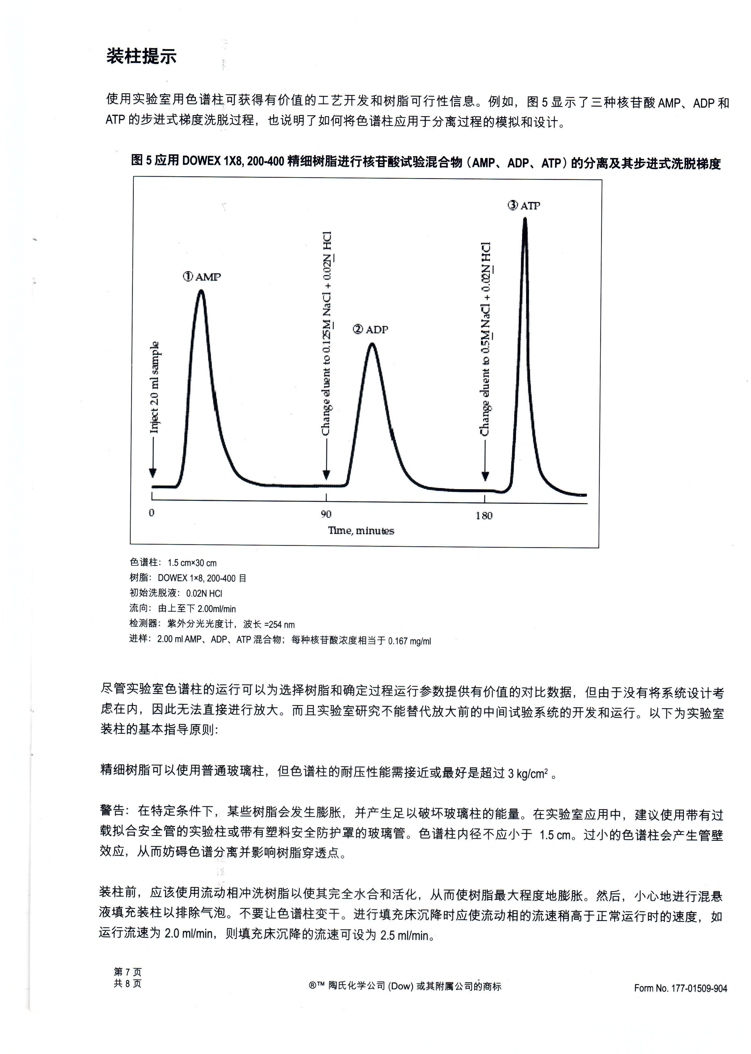 ?????? DOWEX系列離子交換色譜分離樹脂的骨架材料均為苯乙烯-二乙烯苯,采用特殊的懸浮聚合工藝大規模制備而得,具有良好的化學、物理穩定性。易裝柱,目標組份擴散阻力小,產品質量穩定。因此,DOWEX系列離子交換色譜分離樹脂不僅可以滿足實驗室食品、藥品等精細化工產品的小試工藝開發,也使得工藝的放大更為輕松。