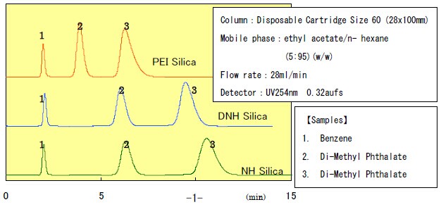 PEI硅膠鍵合的二元胺和三元胺是NH硅膠的3倍?;谶@個原因,PEI硅膠的堿度要比NH硅膠強,并且由于碳鏈較長,PEI硅膠的氫鍵作用要比NH硅膠弱一些。