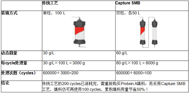 ? ? ?Capture SMB是將第一根層析柱的抗體/蛋白流穿繼續(xù)上樣至第二根層析柱,待第一根層析柱完全滿載后,方結(jié)束其上樣進(jìn)行淋洗,并繼續(xù)進(jìn)行洗脫、再生、再平衡操作,而此時第二根層析柱會獨立進(jìn)行上樣操作。通過切換柱位操作,保證2根層析柱的洗脫、再生、上樣等操作交替銜接進(jìn)行,從而實現(xiàn)工藝與系統(tǒng)硬件設(shè)計的完美結(jié)合,使填料利用率最大化,累積用量大為縮減。