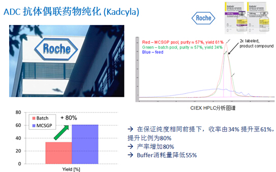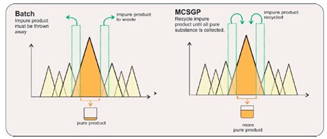 ? ? ?MCSGP工藝,可將含有不純組分的產(chǎn)品回收在一個封閉的環(huán)內(nèi),進(jìn)行循環(huán)式的層析操作,從而最大限度地提取純產(chǎn)品,使得收率和純度二者兼得。