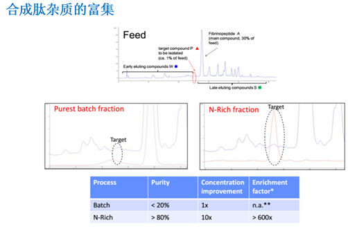 ? ? ??N-Rich工藝是微量物質(zhì)的富集過程,比如將產(chǎn)品的相關(guān)雜質(zhì)選擇性地富集在一個循環(huán)的層析過程中,待富集至目標(biāo)量,再進(jìn)行洗脫回收。該方法特別適用于分離與產(chǎn)品有關(guān)的雜質(zhì),如異構(gòu)體和聚集體,并同時用于發(fā)現(xiàn)研究。
