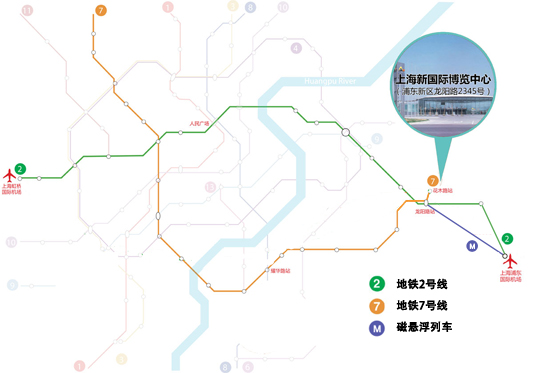 上海新國(guó)際博覽中心戰(zhàn)略性地坐落于浦東經(jīng)濟(jì)開發(fā)區(qū),距離上海新國(guó)際博覽中心600米處有一大型交通樞紐站,即龍陽(yáng)路站(位于龍陽(yáng)路上),包括多條路公交線路起點(diǎn)站、軌道交通2號(hào)線龍陽(yáng)路站、軌道交通7號(hào)線龍陽(yáng)路站以及磁懸浮列車終點(diǎn)站。從2號(hào)線龍陽(yáng)路站步行到展館大約需10分鐘;從7號(hào)線花木路站步行到展館大約1分鐘。