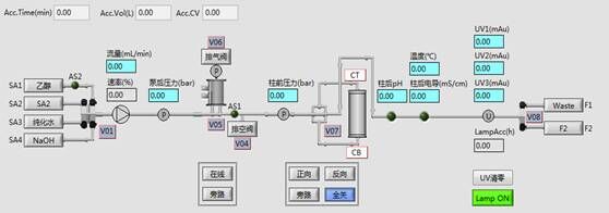 層析系統軟件符合新版GMP規范,采用圖形化界面、全自動操作,簡明扼要,任何操作及狀態均可實時顯示在主界面狀態欄中,自動化程度高。結合了大量的容錯性設計,貼合生產實際,降低了對研發人員的技能要求。