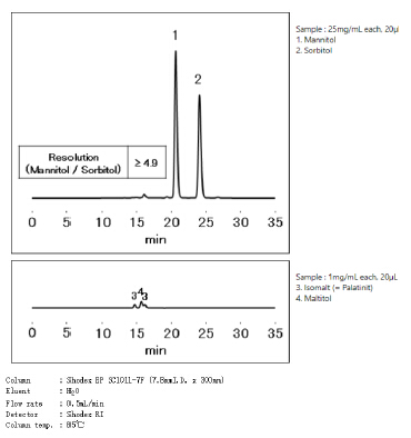 歐洲藥典EP和日本藥典JP規(guī)定,分析甘露醇使用Ca型強(qiáng)陽離子交換柱,色譜柱尺寸7.8*300mm,甘露醇與山梨醇的分離度達(dá)到2以上。同樣對應(yīng)Shodex SUGAR SC1011-7F,能夠符合歐洲藥典/日本藥典的要求。