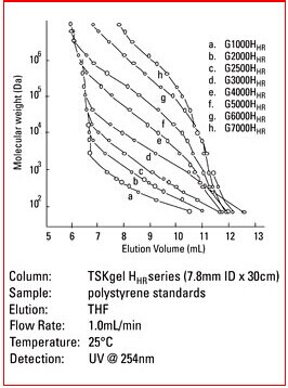 3. Hhr型色譜柱為常規(guī)的GPC色譜柱,尺寸為7.8mm ID x30cm。當(dāng)使用此類常規(guī)色譜柱時(shí),大多數(shù)的HPLC系統(tǒng)無(wú)需進(jìn)行針對(duì)柱外峰展效應(yīng)的優(yōu)化。