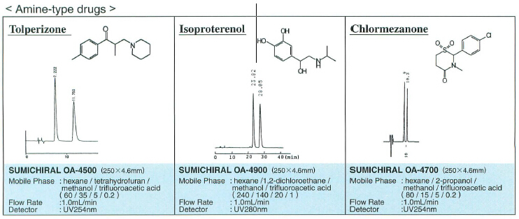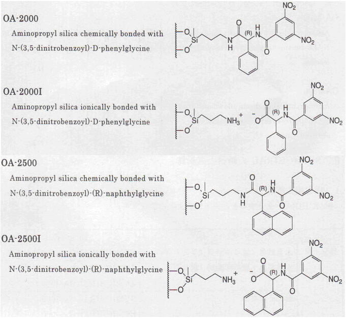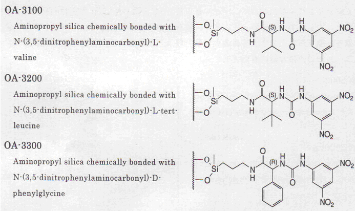 Pirkle型手性柱是將氨基酸的3,5-二硝基苯酰基衍生物作為手性選擇劑,改良型是將萘乙二胺二鹽酸鹽作為手性選擇劑。主要通過電荷移動和氫結(jié)合相互作用來識別手性。OA-2500或OA-3300可有效分離含有-COOH的手性化合物。采用將氨基酸的N位進(jìn)行NBD標(biāo)記的方法,用于D型氨基酸的微量分析。此外,OA-4000系列在胺類系醫(yī)藥品、酒精類、酯、氫胺等眾多化合物正相直接分離方面發(fā)揮了優(yōu)越的性能。